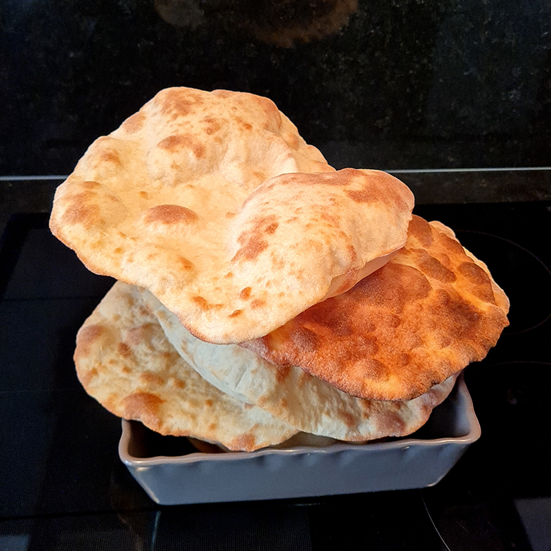 À l’inverse, si vous souhaitez un pain pita plus moelleux, il faudra laisser vos pâtons avec un peu plus d’épaisseur et réduire le temps de cuisson.